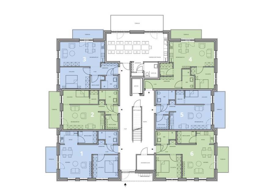 Die Gemeinschaftsflächen und insbesondere der ausgestattete Gemeinschaftsraum im Erdgeschoss stehen allen Bewohnern gleichermaßen zur Verfügung. Die Nutzung ist im Mietpreis bereits inbegriffen.