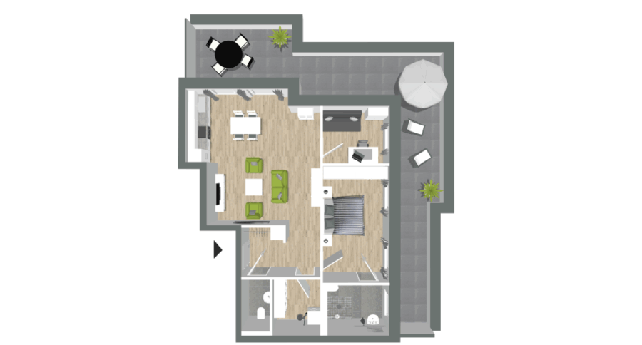 Die Wohneinheit im Staffelgeschoss verfügt über eine Wohnfläche von etwa 89,25 m². Die Seniorenwohnung umfasst einen Flur mit Garderobennische, ein Wohnzimmer mit offener Küche inkl. Einbauküche, Schlafzimmer, Gästezimmer, barrierefreies Bad mit Stütz- und Haltegriffen, Gäste-WC, Hauswirtschaftsraum mit Waschmaschinenanschluss sowie eine Dachterrasse (in der Wohnfläche zu 25% berücksichtigt). Des Weiteren ist ein Außenstellplatz der Wohnung zugeordnet.
